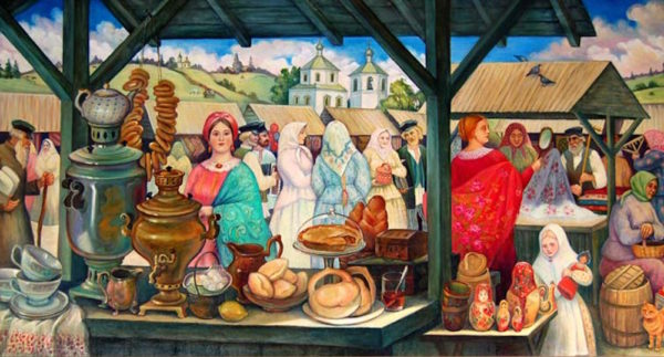 Ярмарки это давняя русская традиция. В городах и больших селах на площади ставили торговые палатки, балаганы и просто телеги, с которых и велась торговля.